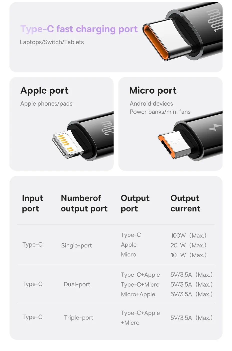 One universal cable is enough to power up to 3 devices at the same time. Among other things, the USB-C connector allows you to charge laptops, tablets and smartphones with up to 100W of power. Lightning 20W fits Apple branded devices. Micro USB allows you to power phones, powerbanks, and even hand fans and desk lamps, among other things.