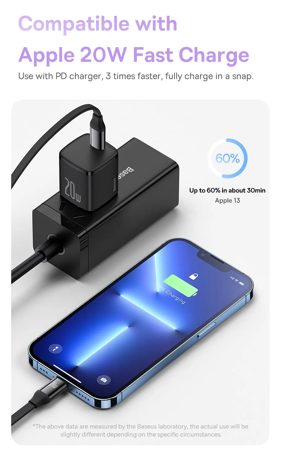 The cable supports the most popular fast charging protocols and is compatible with 20W chargers. For example, you can charge an iPhone 12 to 60% in about 30 minutes or a MacBook Pro to 100% in about 2 hours. It is also perfect for Xiaomi, Samsung and other smartphones. What's more, the copper reinforced cores ensure not only fast but also safe charging.