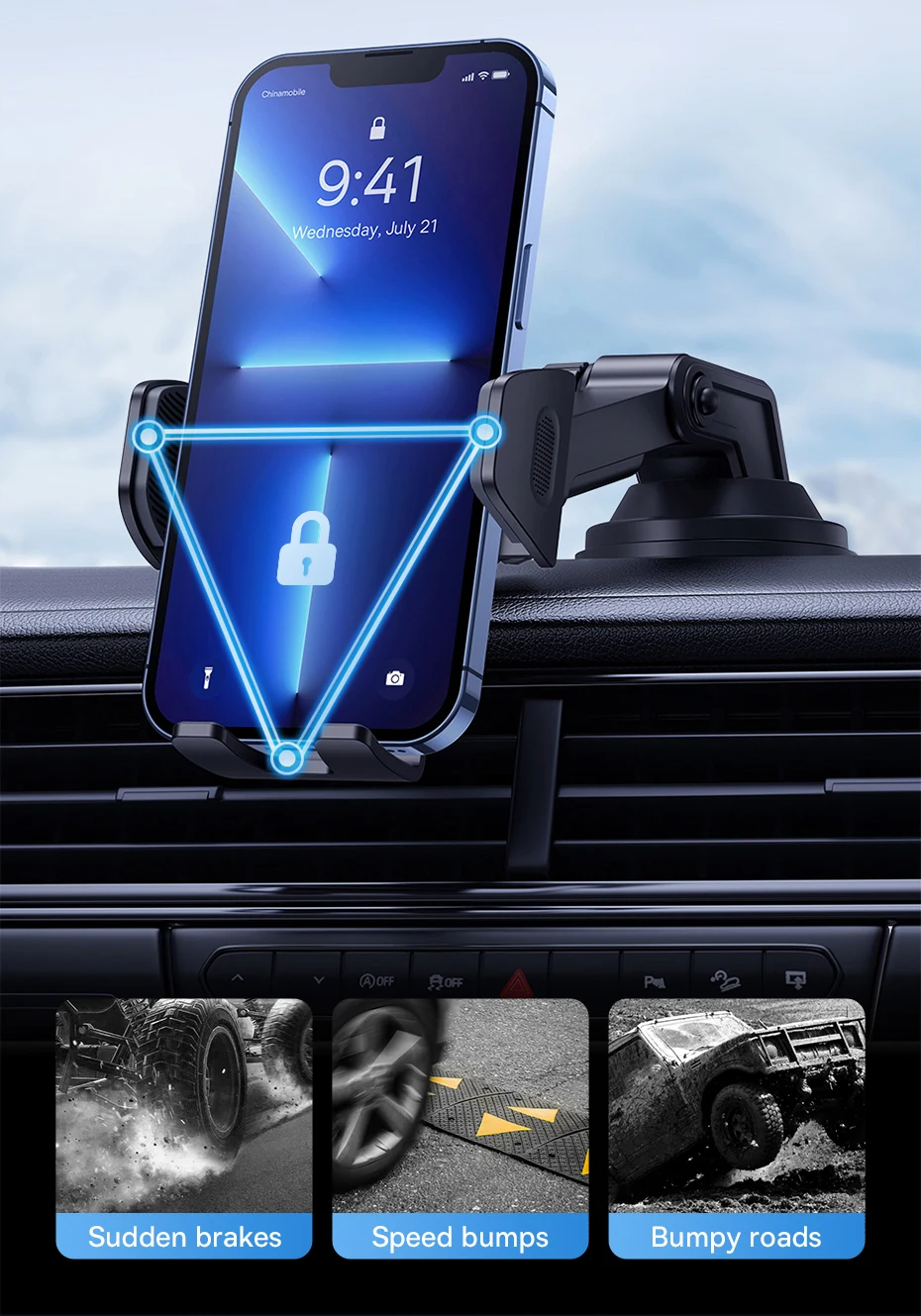 - Protect phones from sudden brakes, speed bumps, bumpy roads, and more