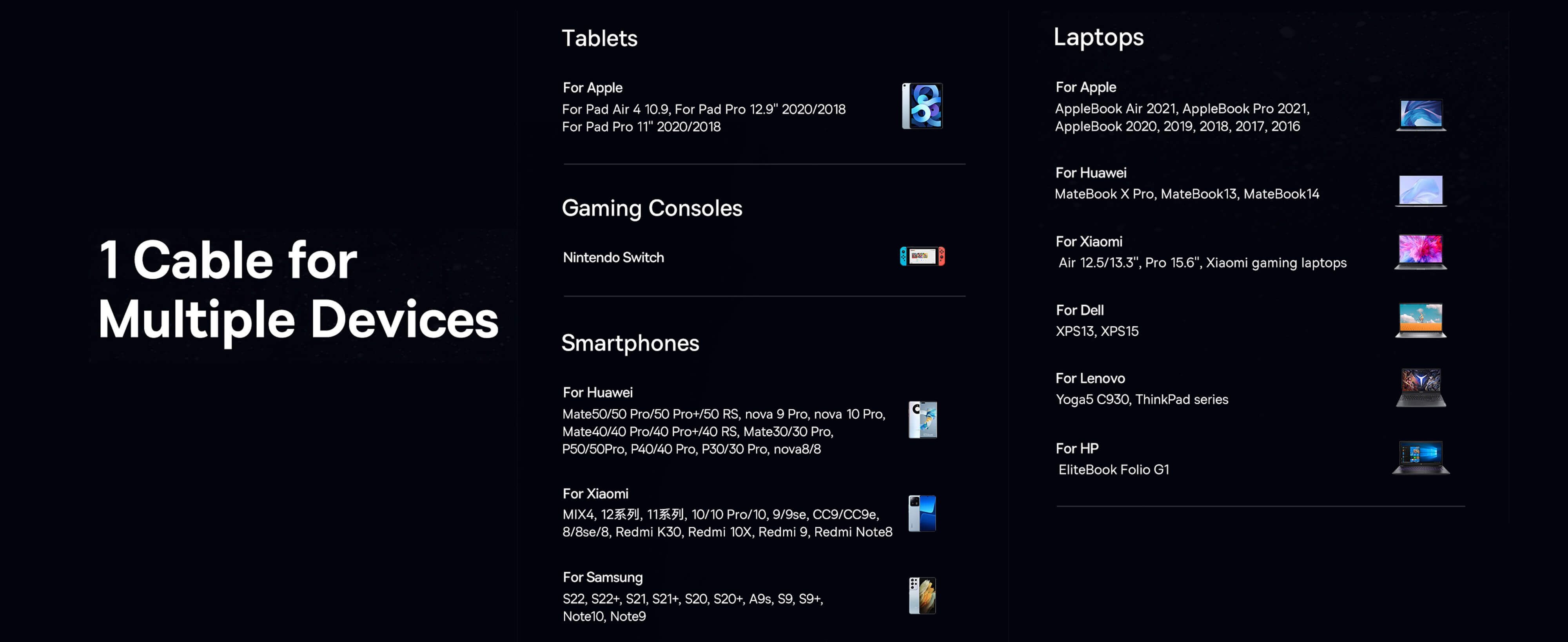 Brand Compatibility | Apple, Samsung, Huawei, Xiaomi, Dell XPS, Lenovo, HP, Nintendo Switch, Google Pixel |
