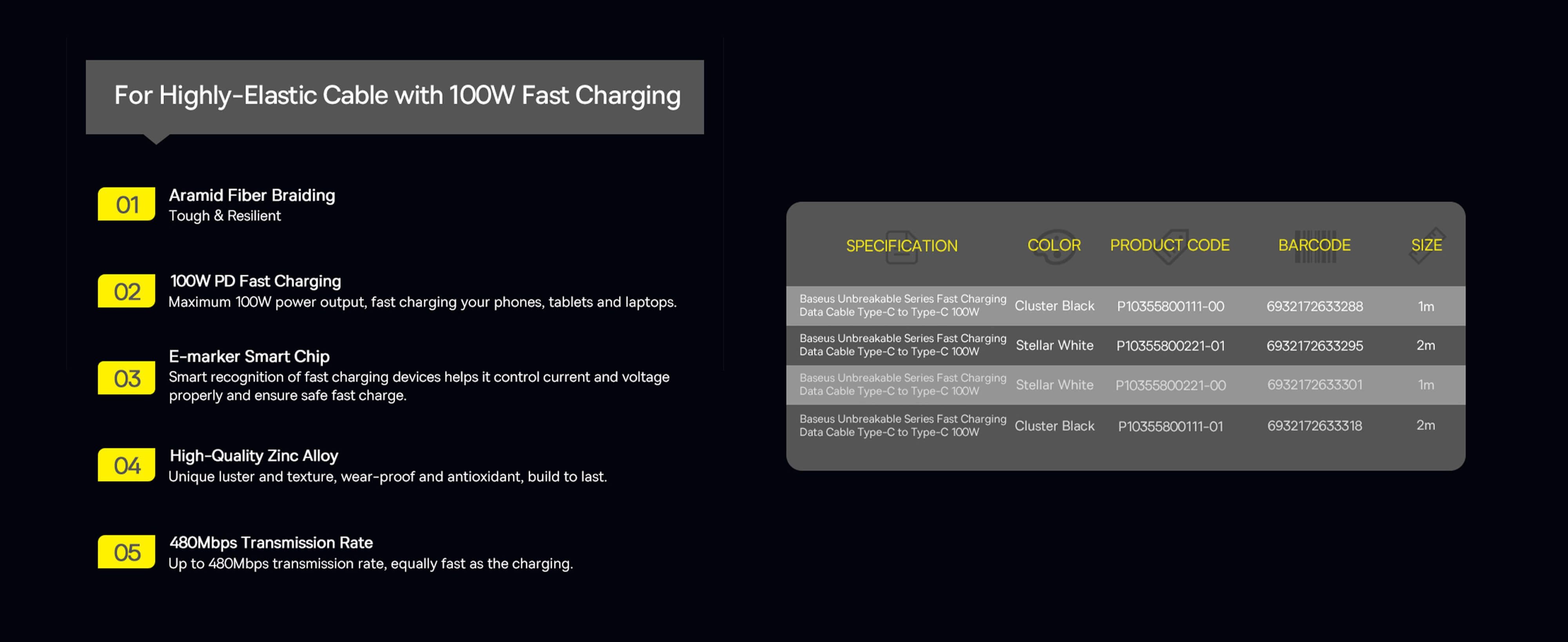 Name | Baseus Unbreakable Series 100W PD Fast Charging Data Cable Type-C to Type-C 1M - White |