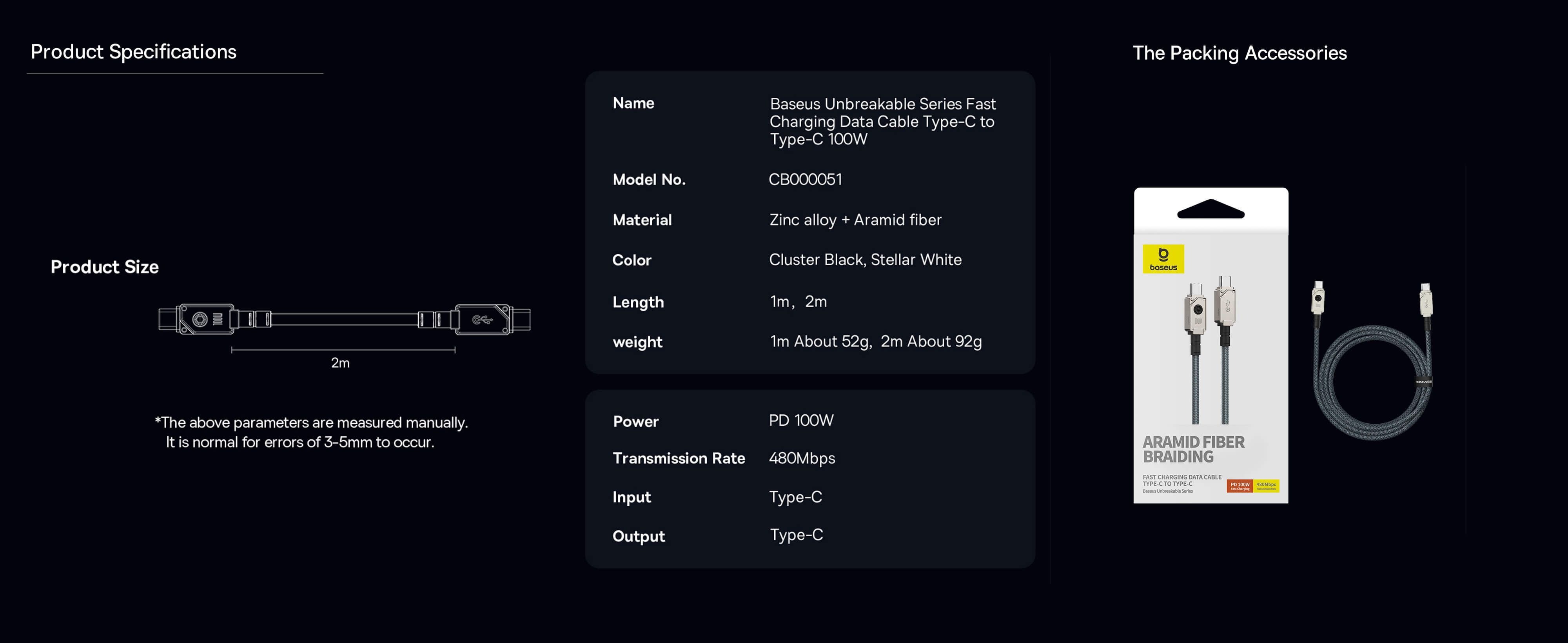 Baseus Unbreakable Series USB Type-C to Type-C 100W is a Type-C cable with data transfer and fast charging capabilities up to 100W. Its sturdy, break-resistant, and highly durable design features a twist-resistant Aramid fiber jacket. The integrated smart chip helps control current and temperature, ensuring device safety and compatibility with various phones, tablets, and other USB-C devices.