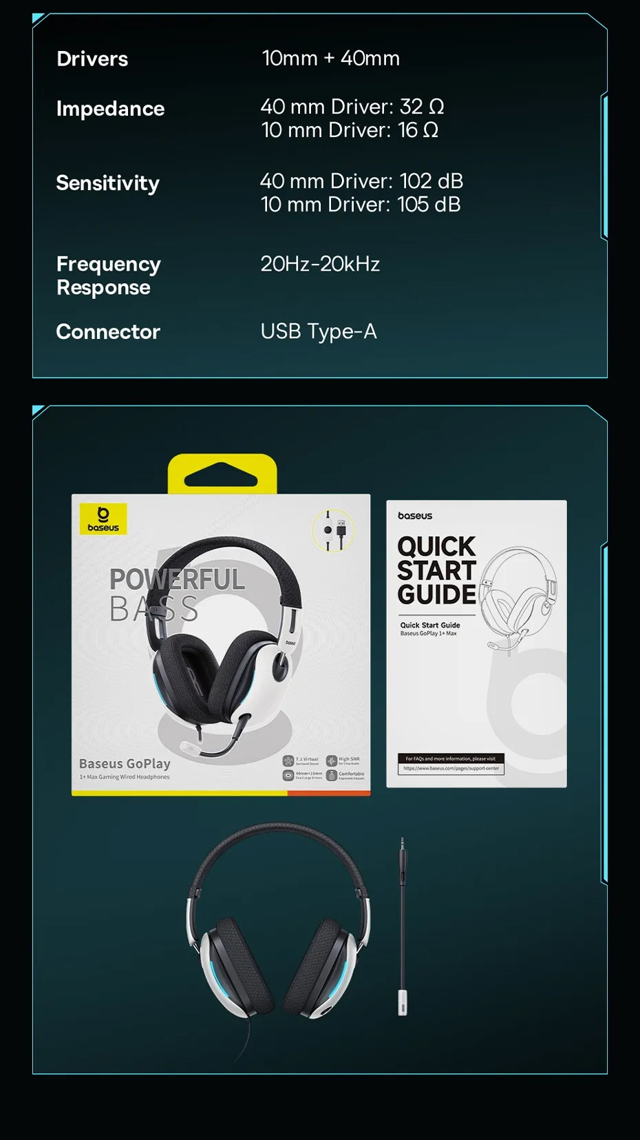 Baseus GoPlay 1+ Max Gaming Wired Headphones7.1 Virtual Surround Sound High SNR for Crisp Audio 40mm+10mm Dual Large Drivers